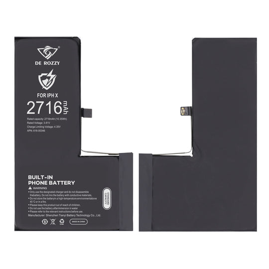 Brand:DerozzyModel:iphone X BatteryBattery Type:Li-ionCapacity:2716mAhVoltage:3.82VLimited Voltage:4.35VSafety:DuaI IC s protectionCharging Time:1-3hoursStandby Time:5-8daysCycle Time:Over 700 timesSale price €4,78Regular price €5,00Sale price €4,78Regular price €5,00 -